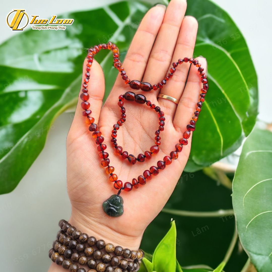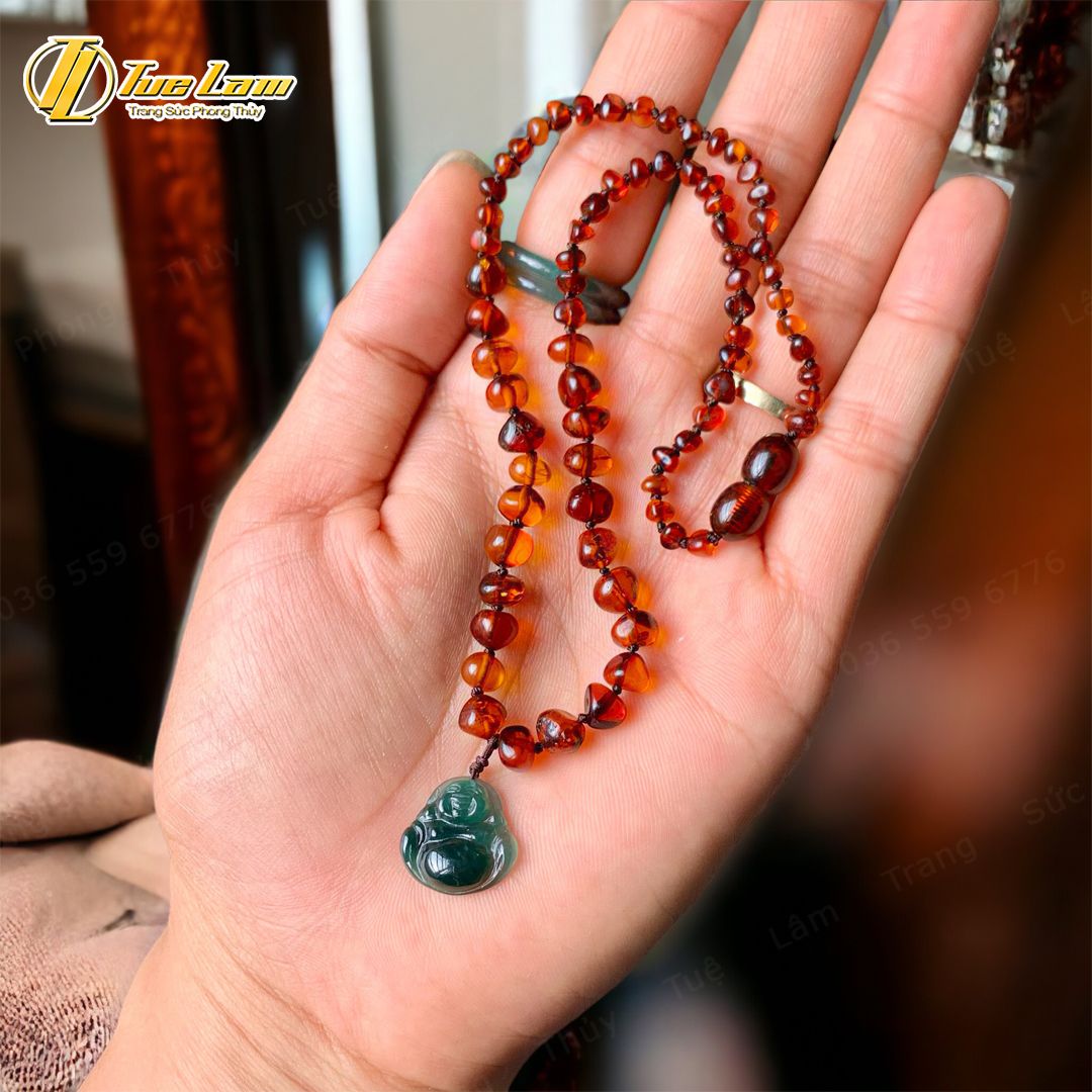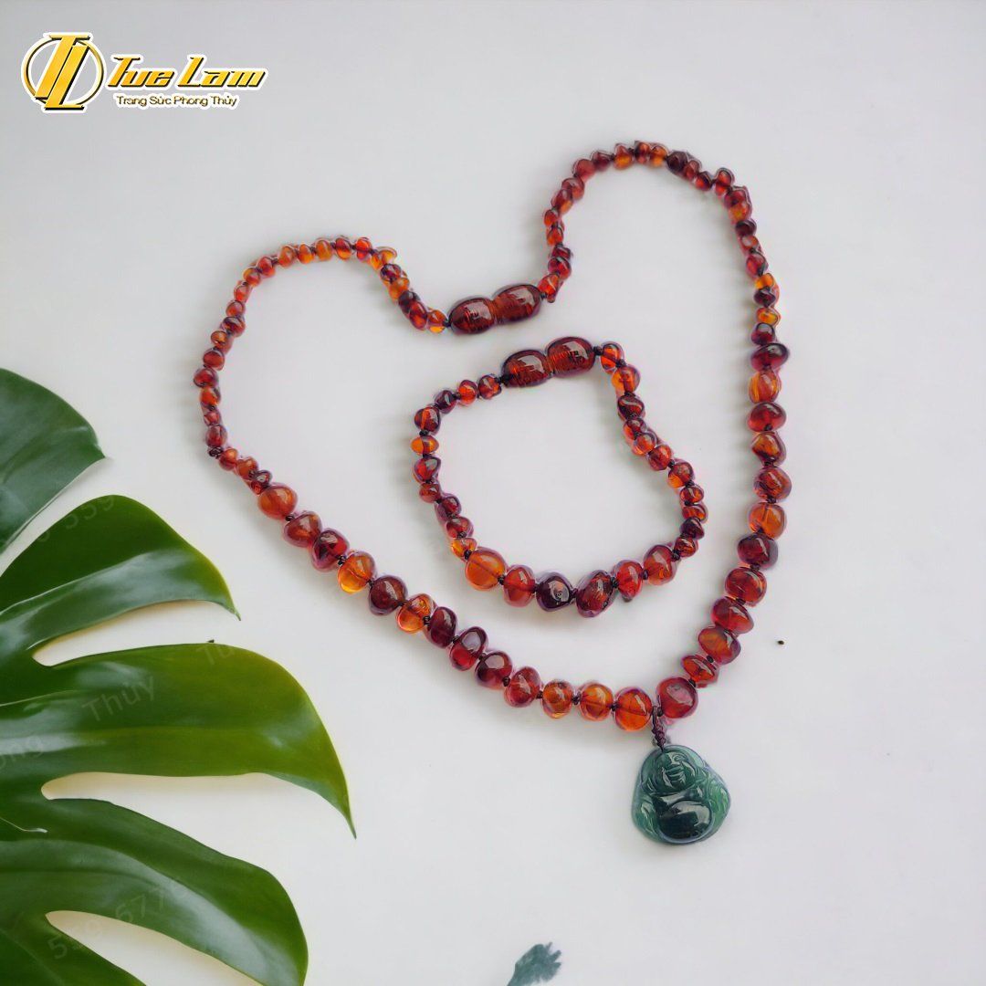 Bộ trang sức amber cho bé vòng tay vòng cổ hổ phách huyết mix phật di lặc lam ngọc bình an