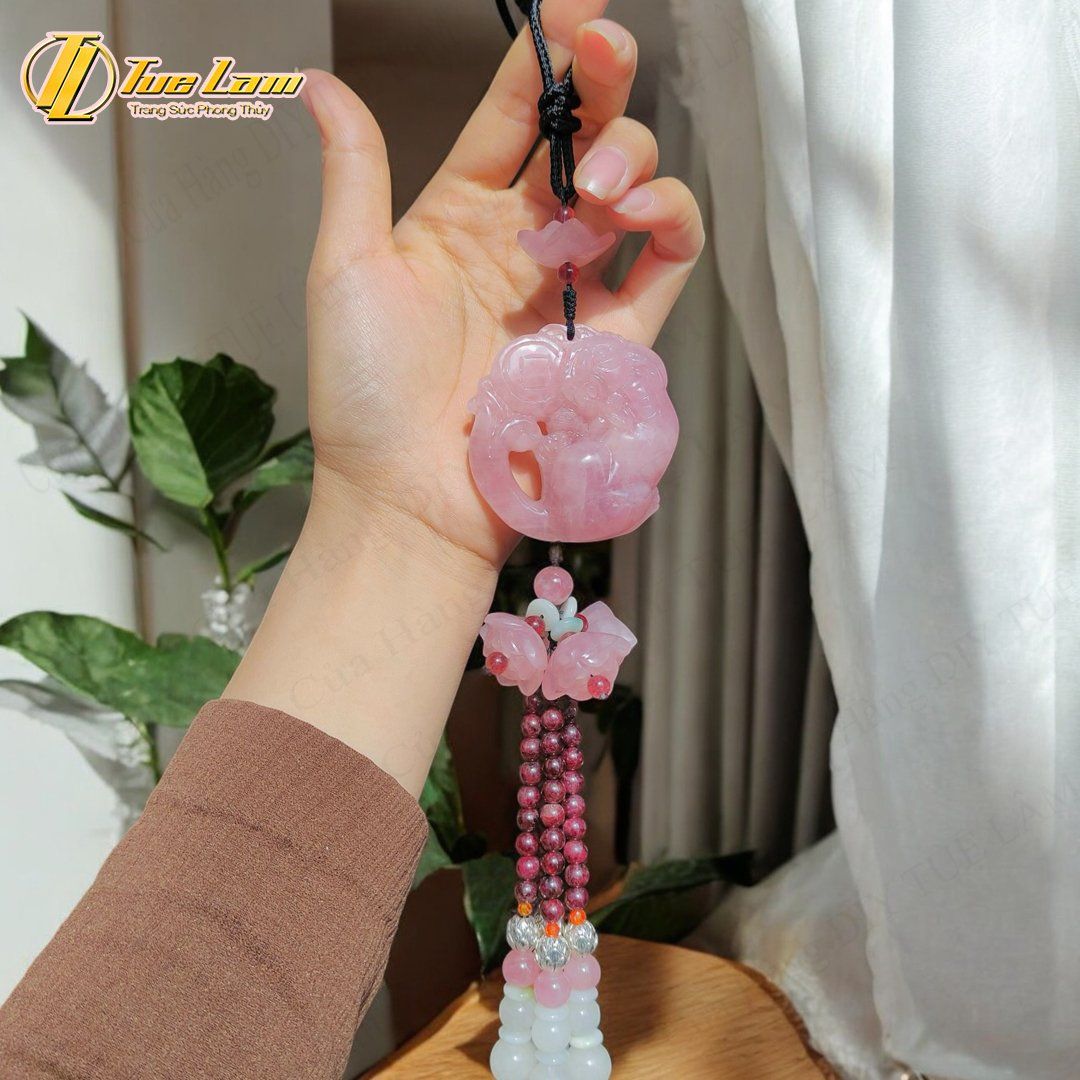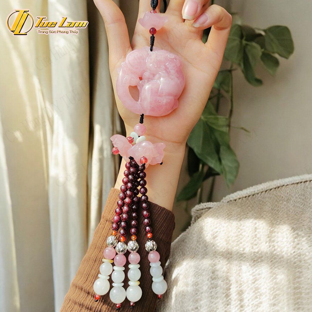 Khánh treo xe ô tô mặt tỳ hưu đá thạch anh hồng hợp mệnh hỏa thổ may mắn bình an