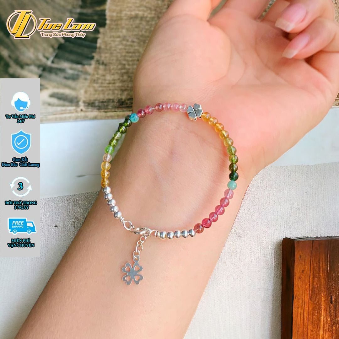 Lắc tay bạc nữ hạt đá tourmaline mix charm bạc cỏ 4 lá xinh xắn, may mắn, bình an