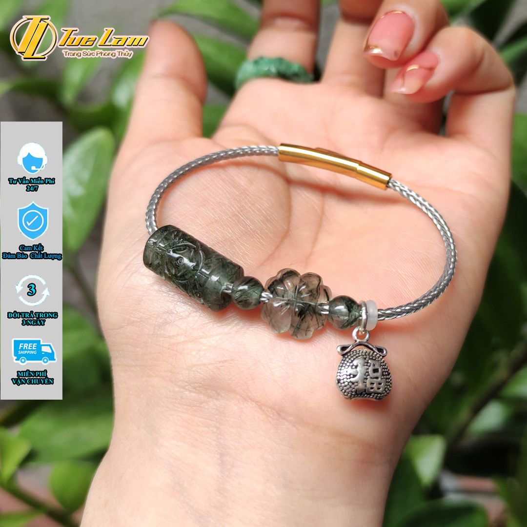 Vòng tay lu thống chạm kim tiền mix cỏ 4 lá may mắn thạch anh tóc xanh hợp mệnh mộc hỏa