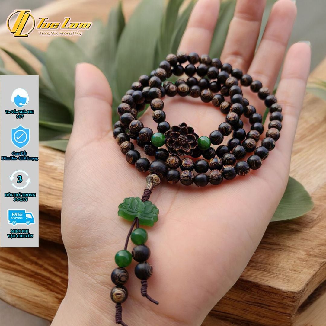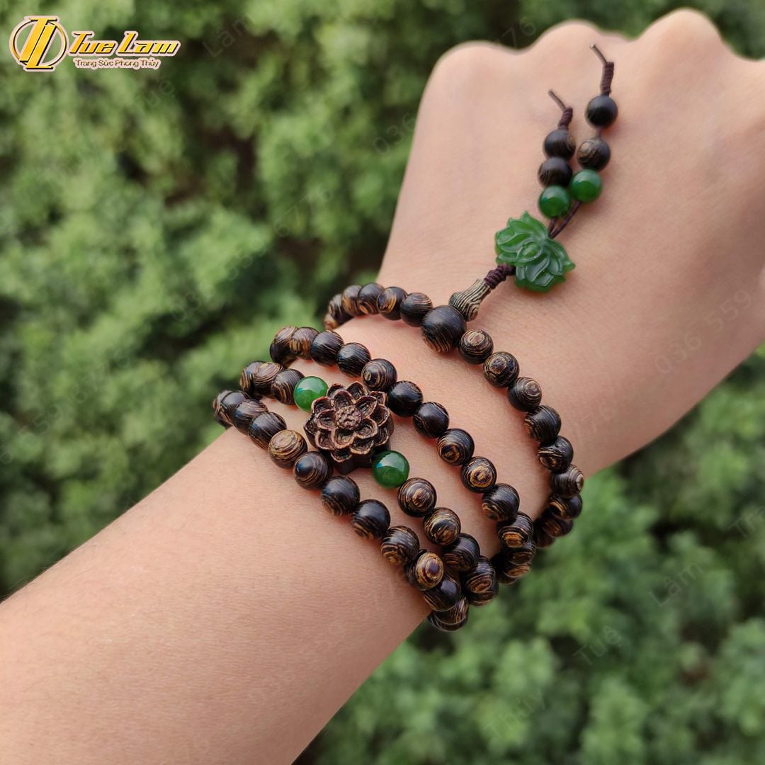 Vòng tay hạt gỗ trầm hương 108 hạt sánh chìm size 6 li mix hoa sen ngọc bích và hoa sen trầm sánh