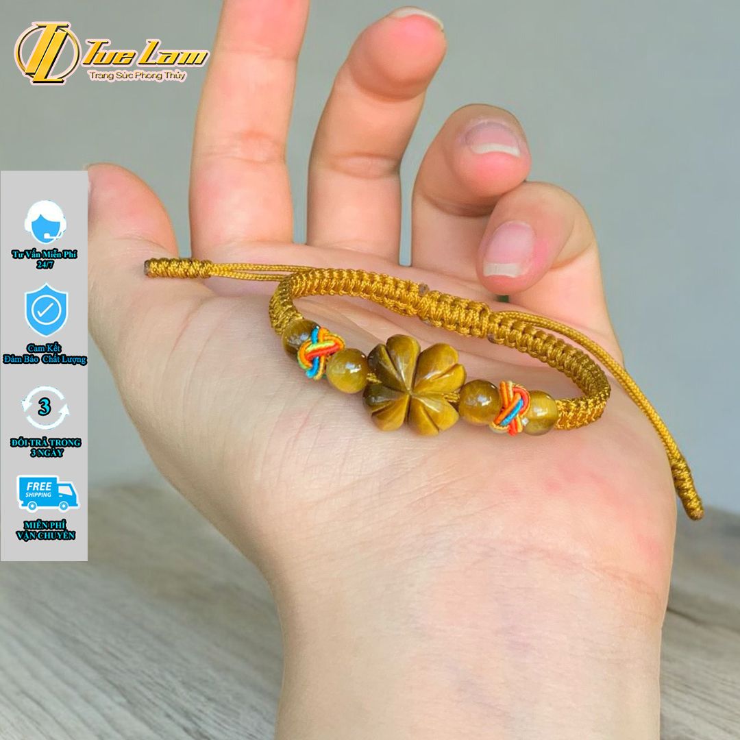 Vòng tay cỏ 4 lá đá mắt hổ nâu vàng hợp mệnh kim thổ bện chỉ handmade may mắn bình an