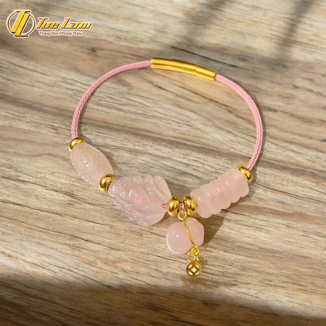 Vòng tay ngũ điếu mix lu thống và hồ ly chúa treo túi tiền đá thạch anh hồng hợp mệnh hỏa thổ trợ duyên tài lộc