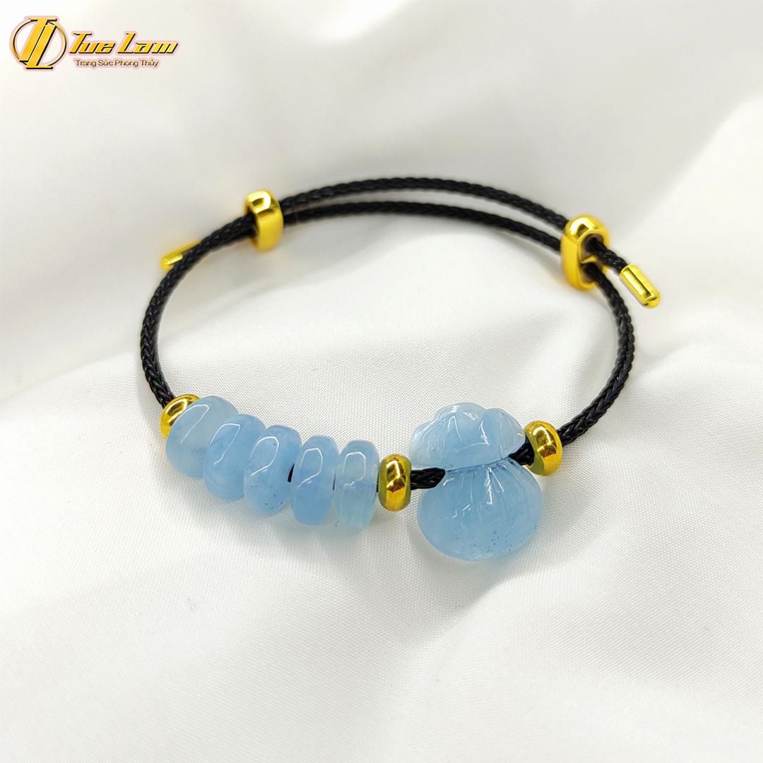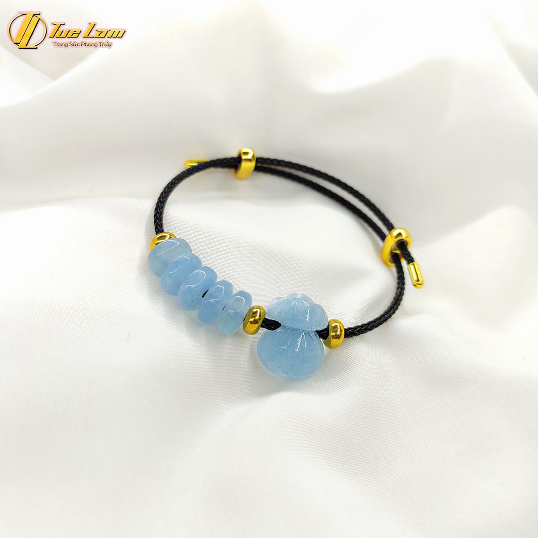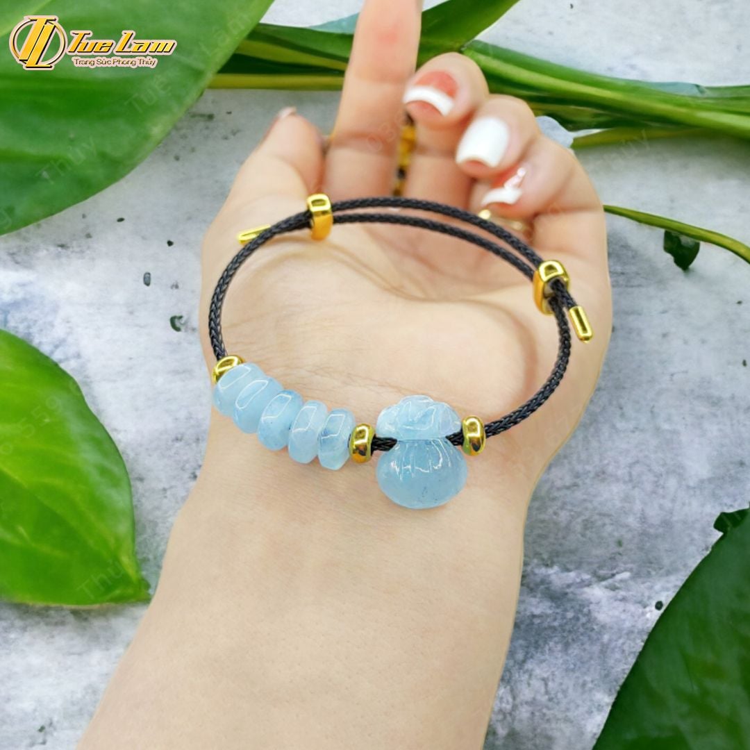 Vòng tay ngũ điếu mix túi tiền đá aquamarine hợp mệnh thủy mộc, thu hút tài lộc, bình an may mắn